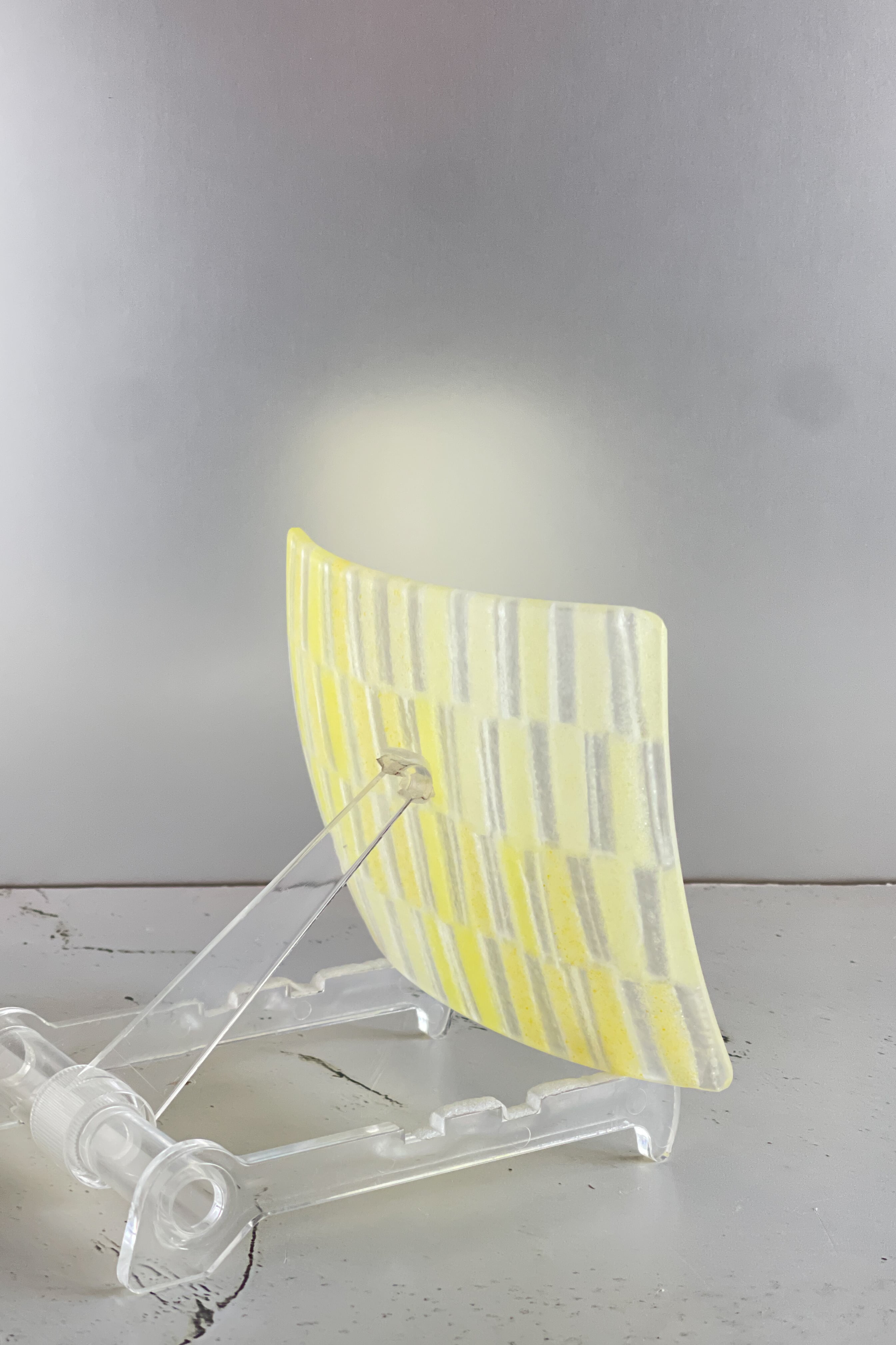 キルンワーク(ガス炉や電気炉)におけるガラスフュージング(ガラスパーツを熔着)技法でベースを制作し、ブロー(拭きガラス)で仕上げる手数を沢山必要とした作品です