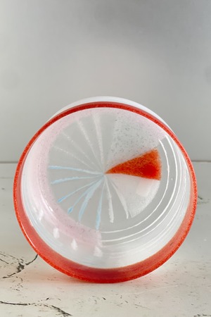 キルンワーク(ガス炉や電気炉)におけるガラスフュージング(ガラスパーツを熔着)技法でベースを制作し、ブロー(拭きガラス)で仕上げる手数を沢山必要とした作品です